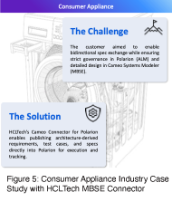 A leading German consumer appliance manufacturer sought to connect architecture development with software requirements management in Siemens Polarion. Their goal was to enable bidirectional exchange of specifications while maintaining strict requirements governance in Polarion and detailed architecture design in Cameo. HCLTech’s Cameo Connector for Polarion delivered this capability, allowing architecture derived requirements, test cases, and subsystem specifications to be published directly into Polarion for execution and tracking. The integration reduced rework, improved alignment between hardware and software teams, and established a governed, traceable process for specification updates. A limited production pilot rollout with only a few users proved successful, with a full enterprise deployment planned for mid-2025.